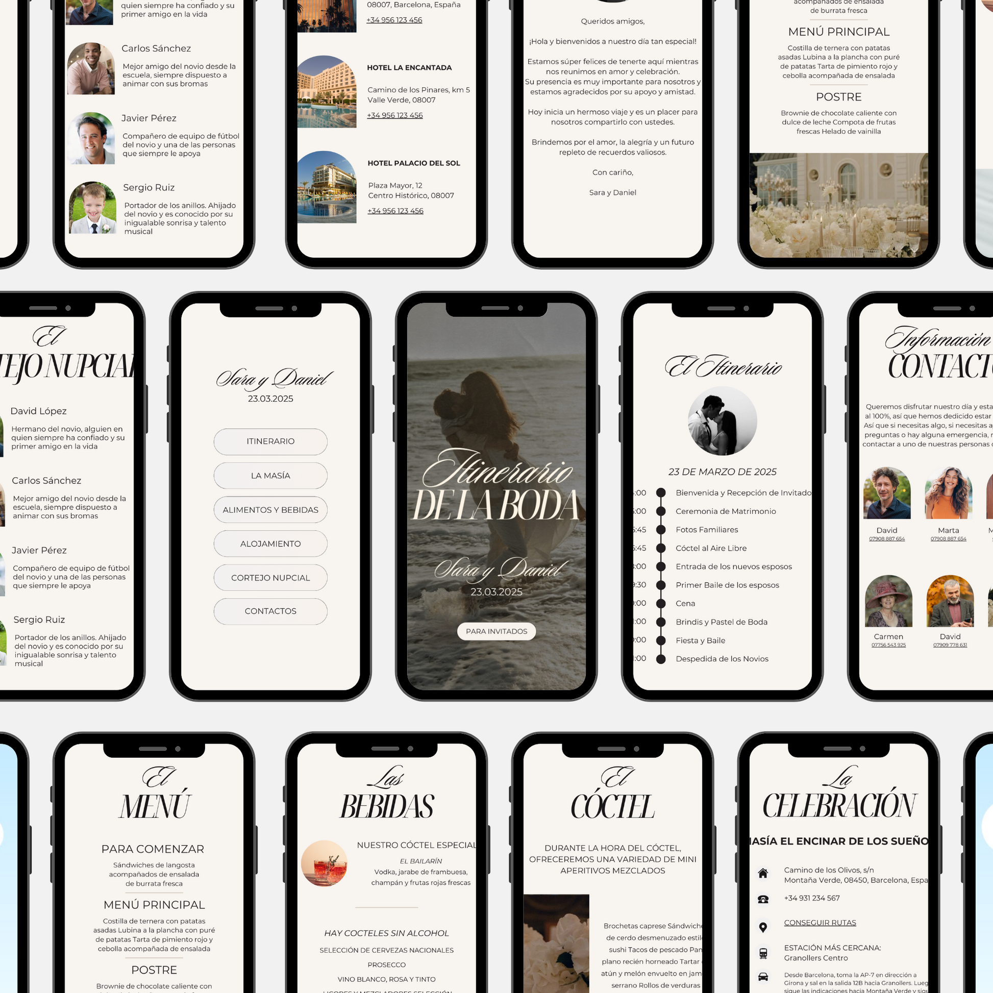 - Itinerario Personalizable: Adapta horarios, ubicaciones y actividades a medida de tu boda para que refleje perfectamente tu planificación.