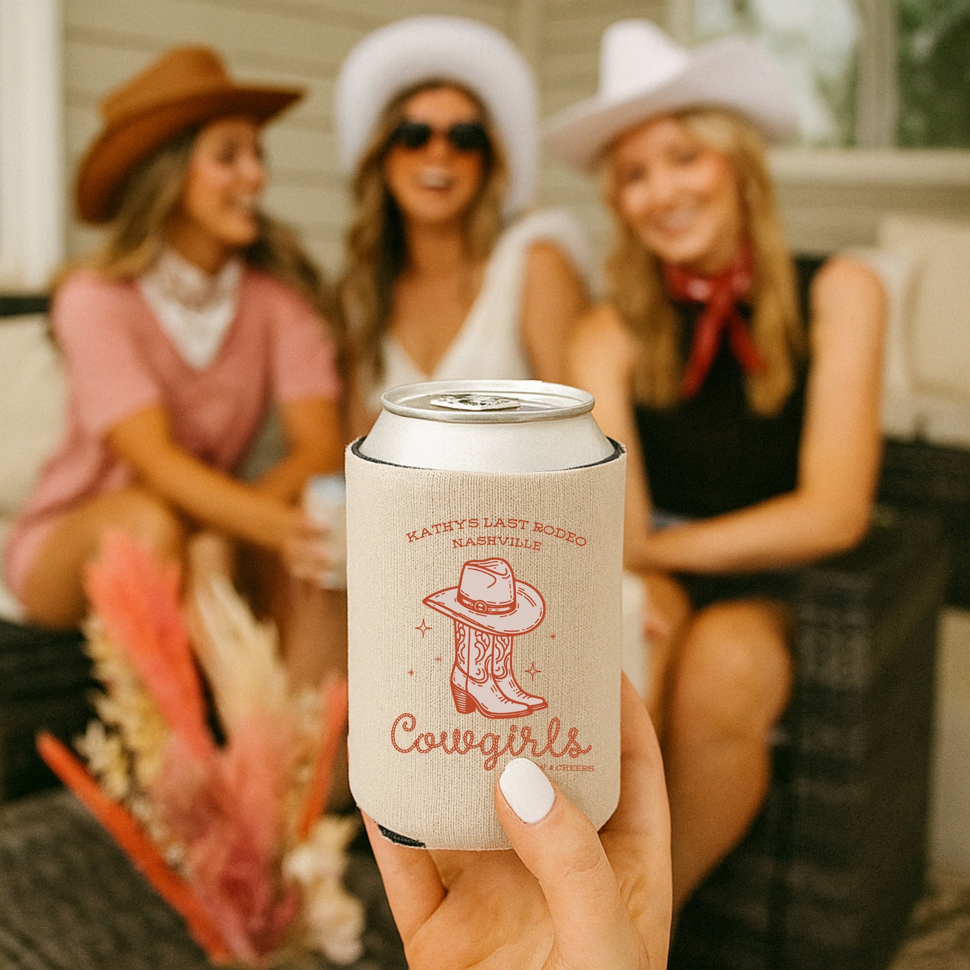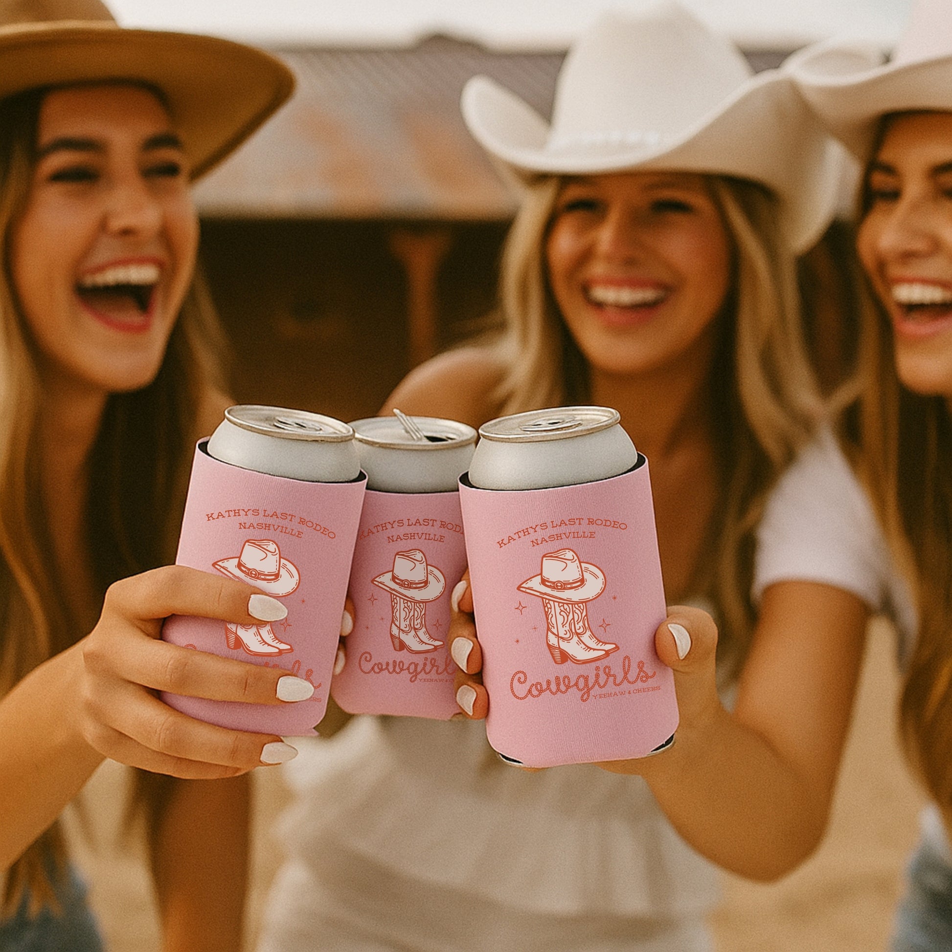 Prepárate para la última cabalgata con tu bride tribe. Ya sea que estén rumbo a Nashville, Austin o montando una fiesta llena de glitter y sombreros en el patio de casa, estas fundas personalizadas mantienen las bebidas frías mientras le dan el toque perfecto a cada foto y brindis.