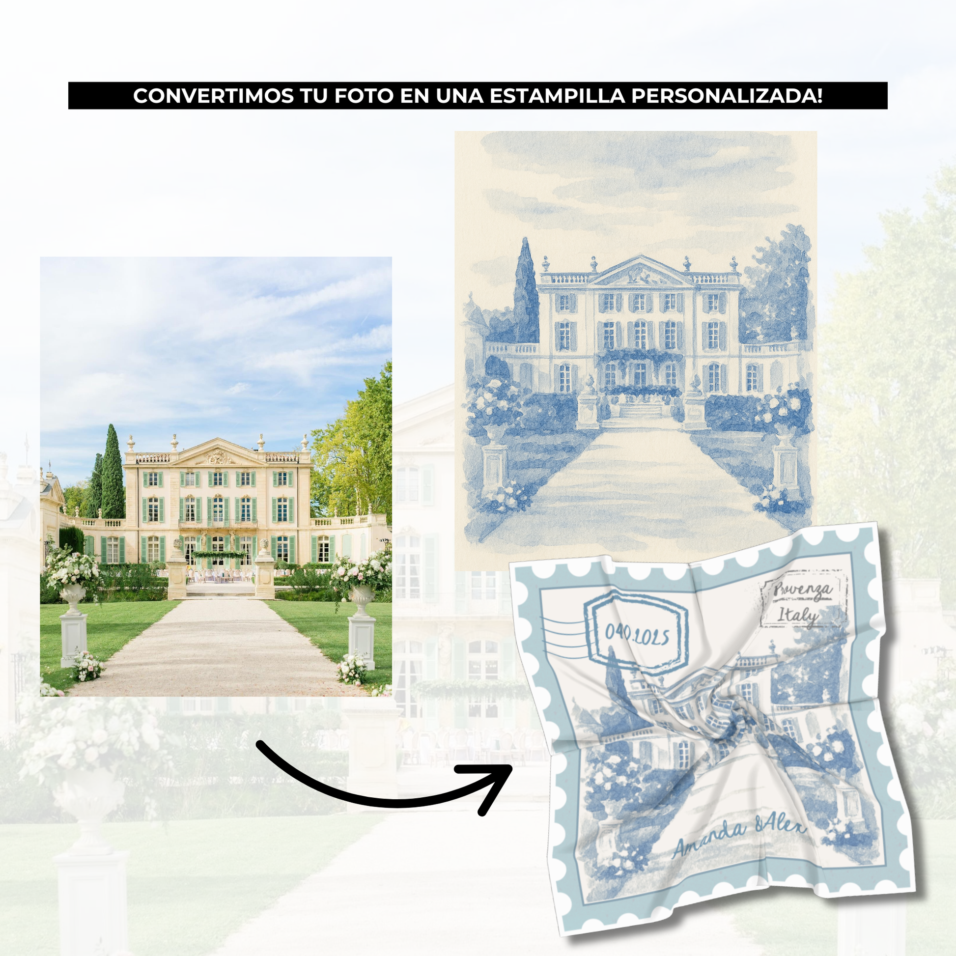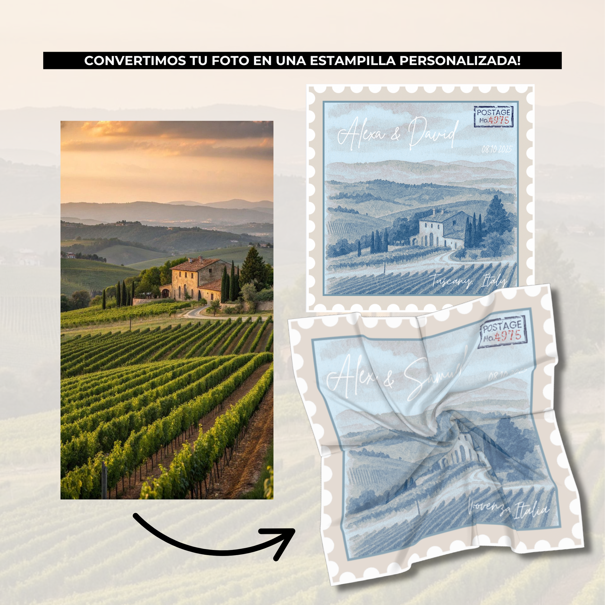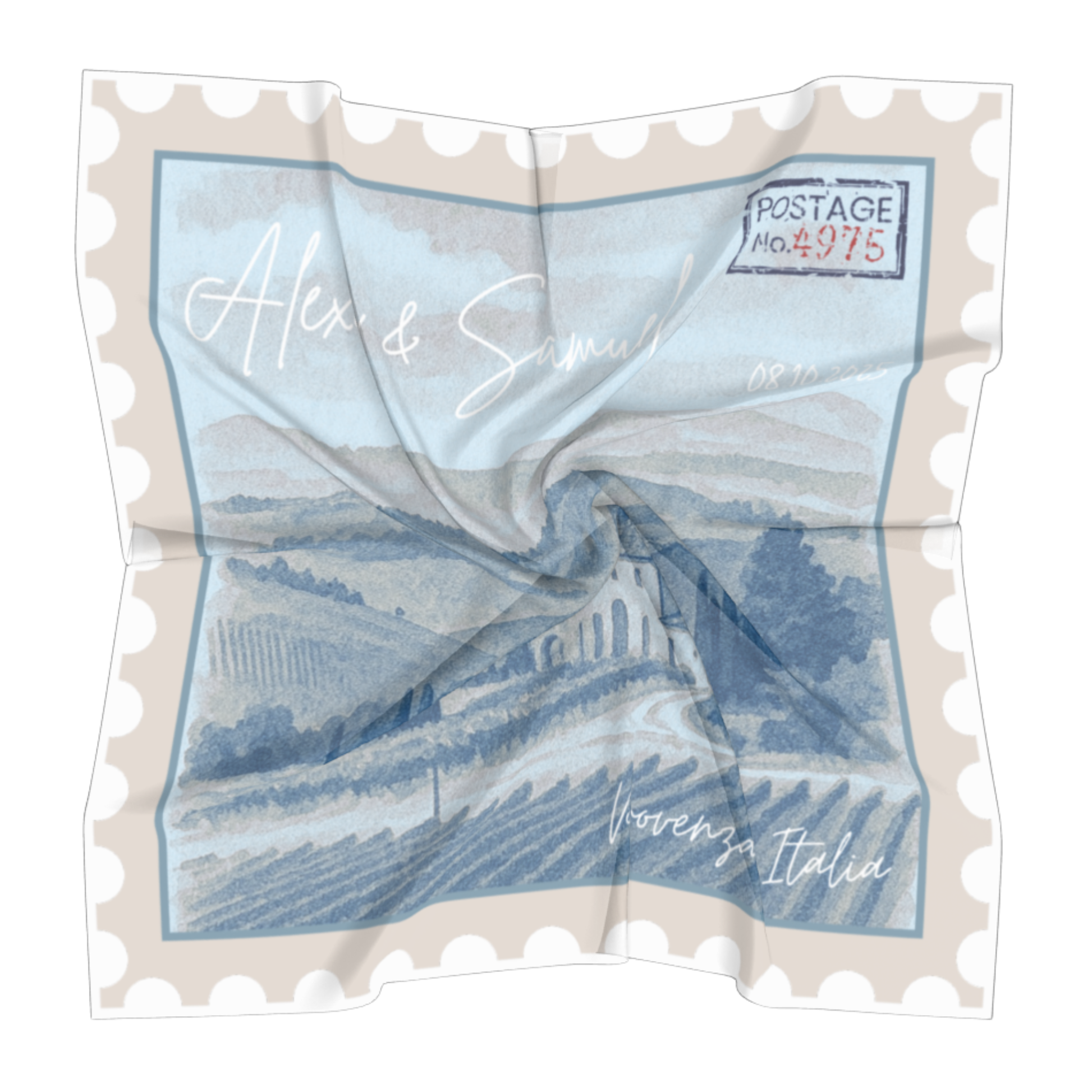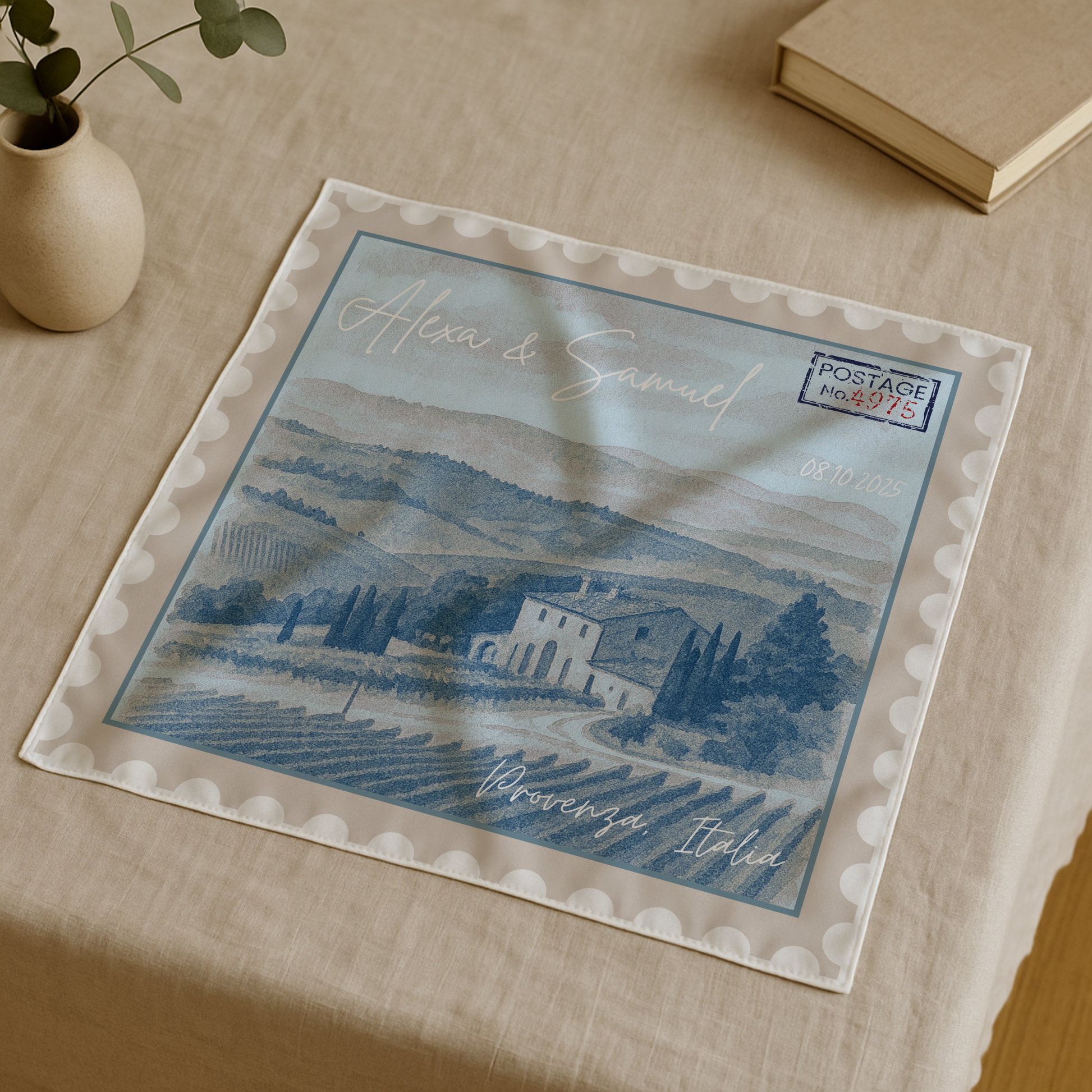 Estos pañuelos personalizados con diseño de sello postal no son un simple accesorio: son un detalle elegante, original y lleno de significado que convertirá tu boda en un evento inolvidable.
