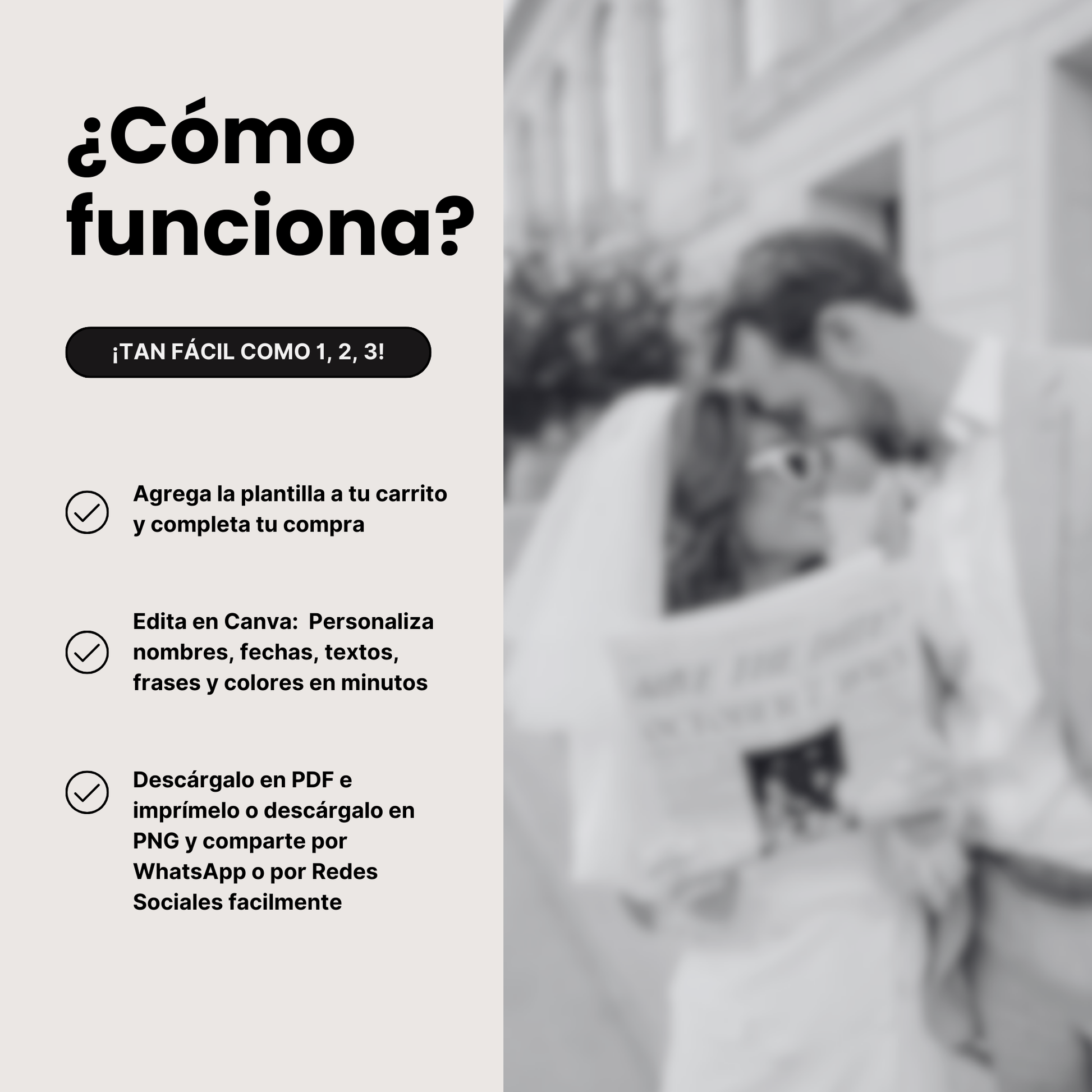 Completamente editable en Canva: Podrás ajustar el texto, los colores, las fotos y cualquier detalle para que refleje tu estilo personal y la temática de tu boda.